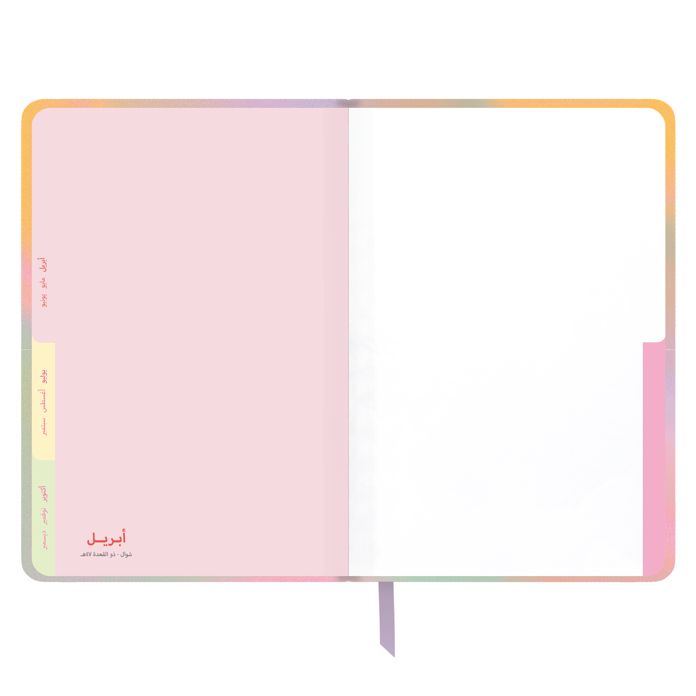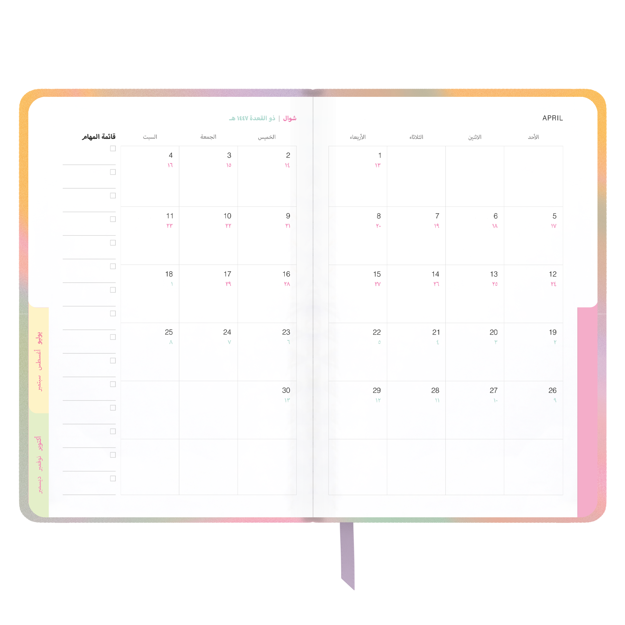 ابدئي عامك بتنظيم جميل مع أجندة “سين” لعام 2026م والذي يشمل كلا ميلادية وهجرية، تصميم متدرّج مستلهم من وهج لحظة عناق الشمس للأفق، تظهر من خلاله أرقام السنة 2026 بأسلوب فني لافت.