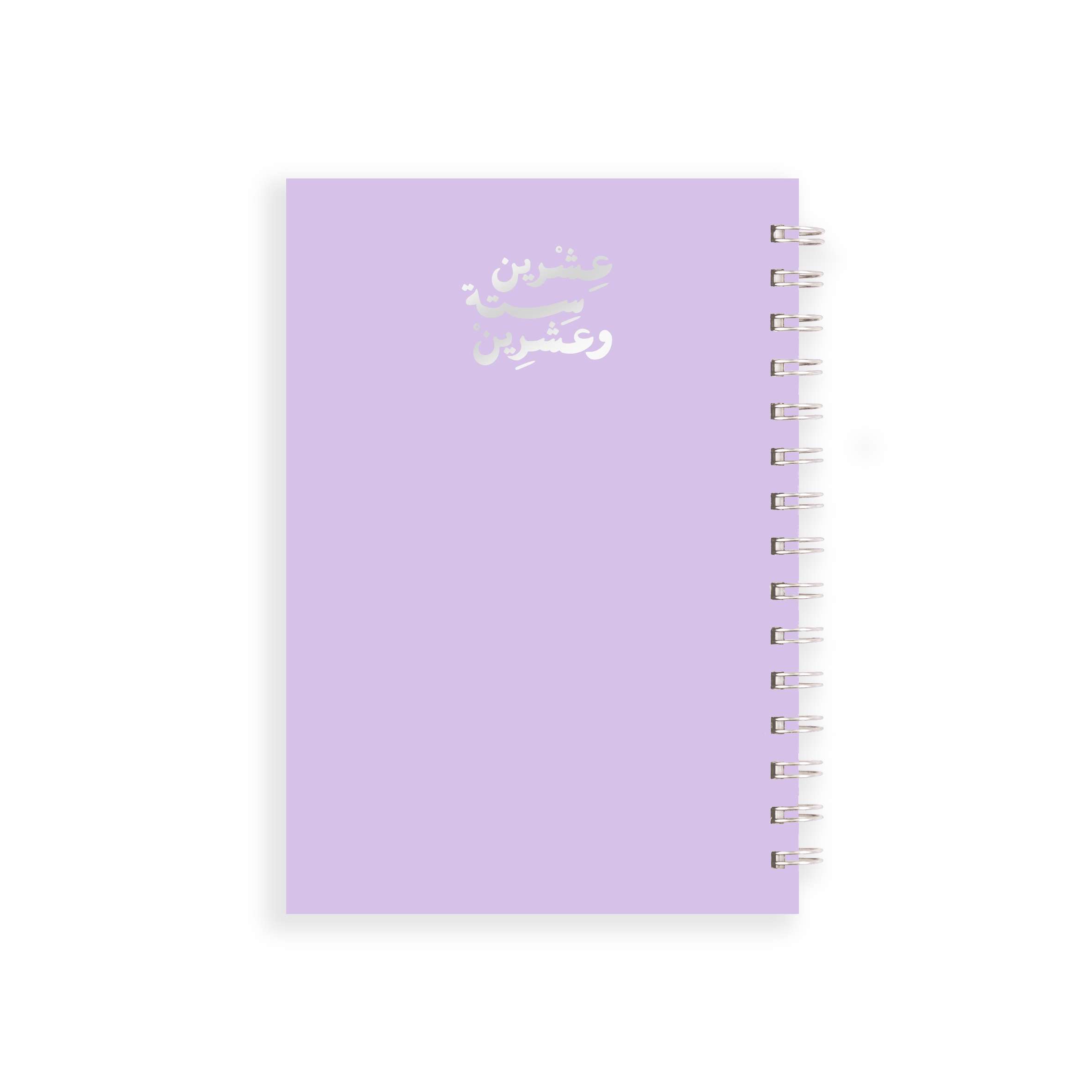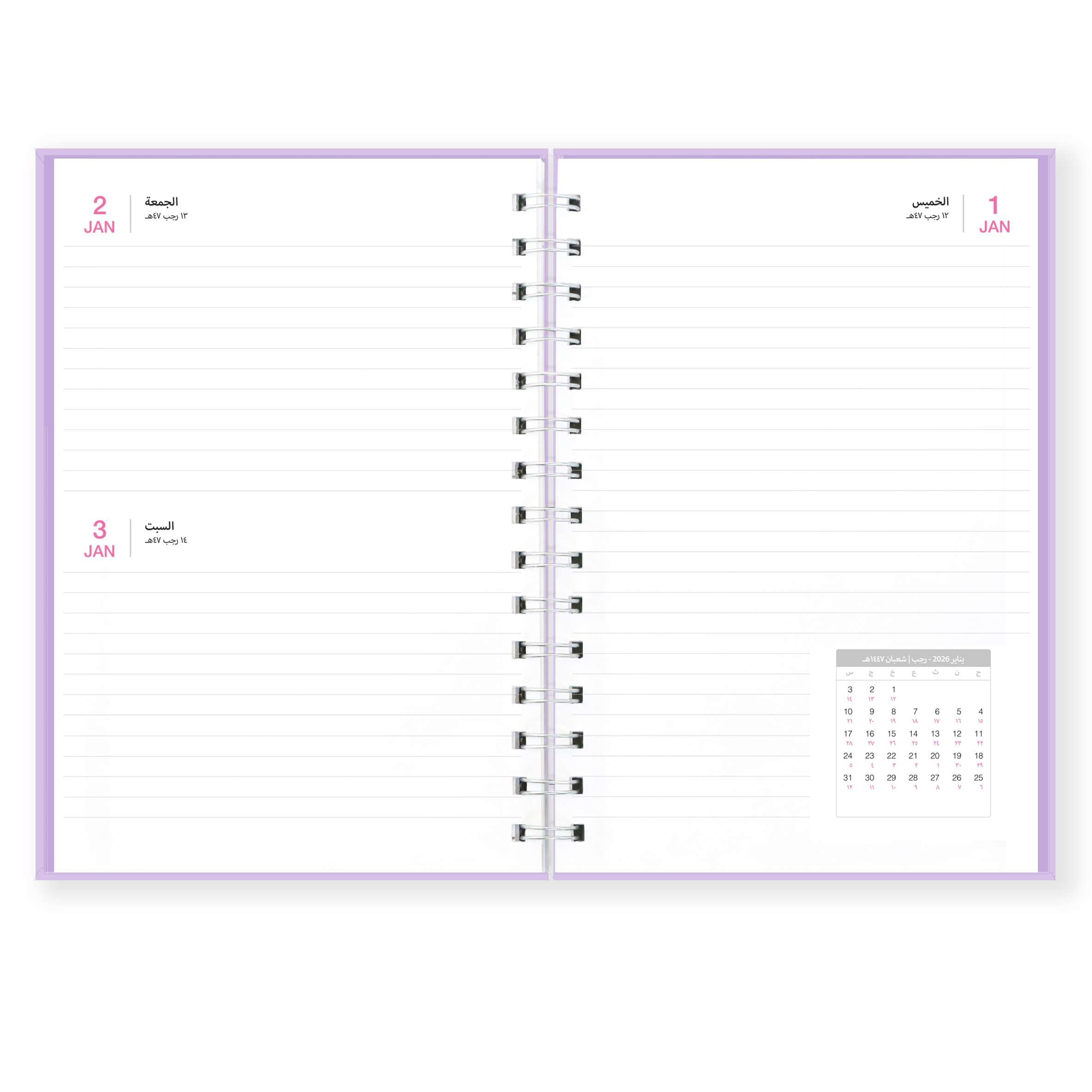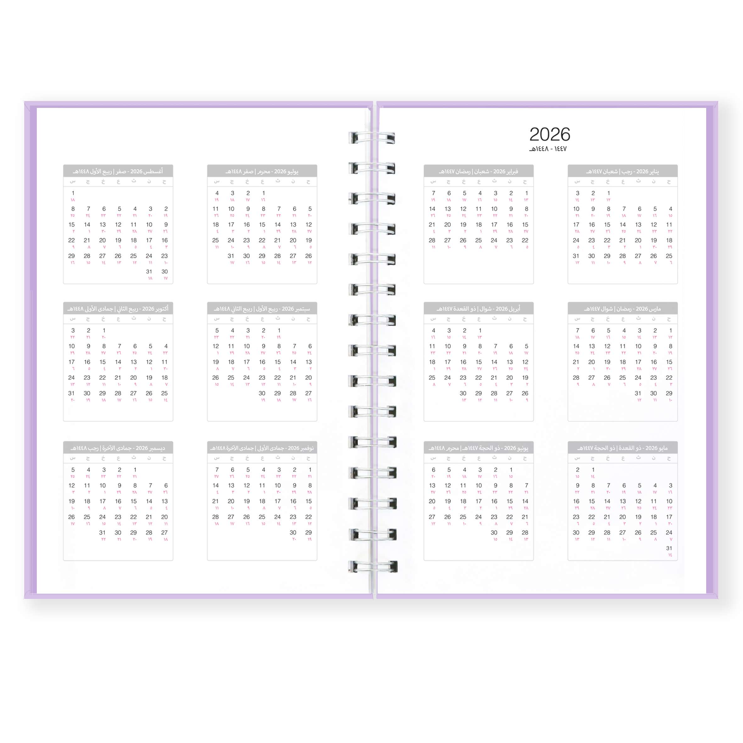 أضيفي لمسة من التنظيم والجمال إلى عامك مع المنظم اليومي الجديد! أجندة لعام 2026م بتواريخ ميلادية وهجرية، والمُصممة بلون البنفسجي الهادئ والساحر، مع عبارة “عشرين ستة وعشرين” مكتوبة بخط يدوي حر بتأثير فضّي.