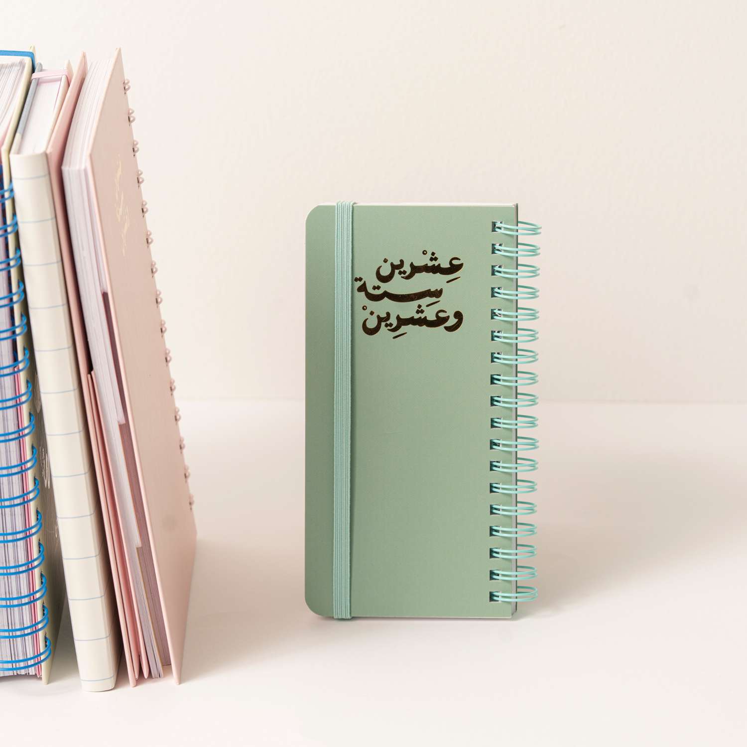 أجندة أنيقة وخفيفة ترافقك طوال العام، بلون تركوازي جذّاب وتفاصيل ذهبية لامعة لعبارة “عشرين ستة وعشرين” بخط يدوي حر. حجمها المثالي يجعلها الرفيقة الأفضل في حقيبتك، مكتبك، ومشاويرك اليومية.